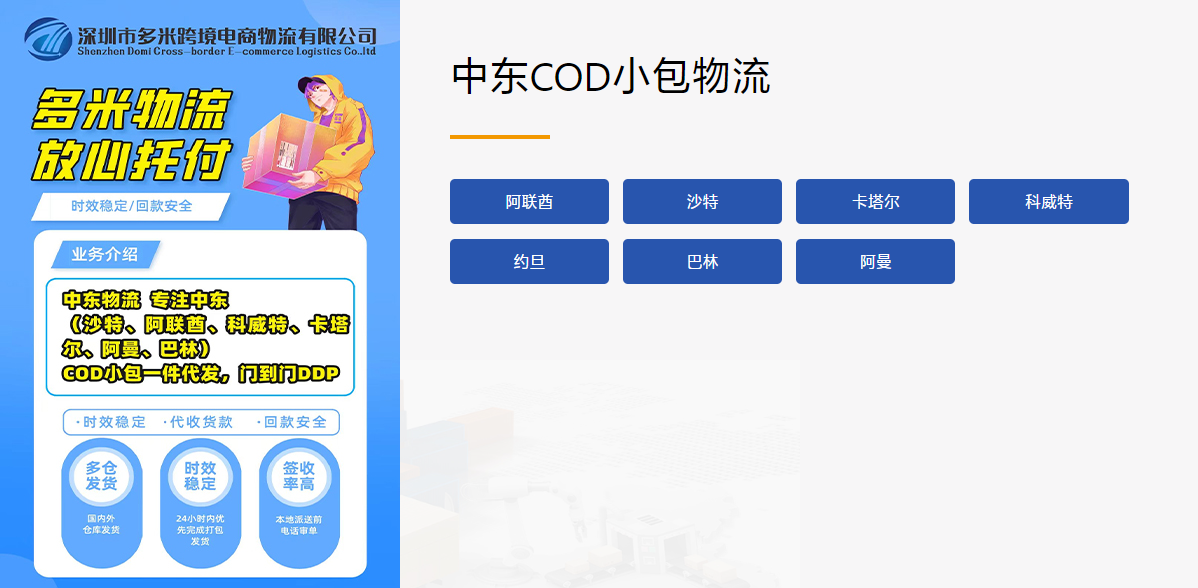 1、多米COD物流头程空运专线,清关快(1-2天),航空包板,时效稳定。